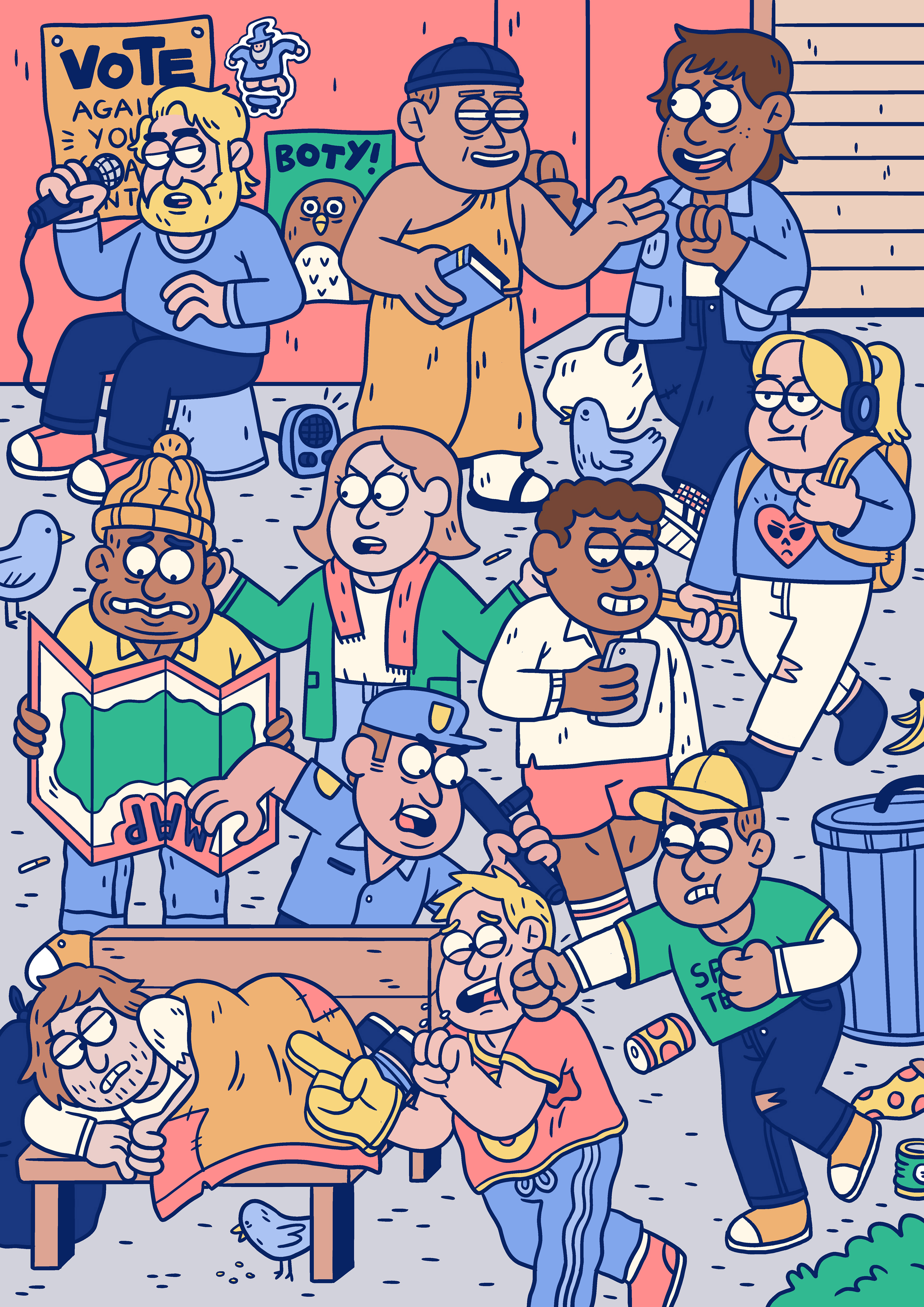 A series of illustrations I made in my final semester at Wintec, depicting different scenes full of ‘people doing stuff.’